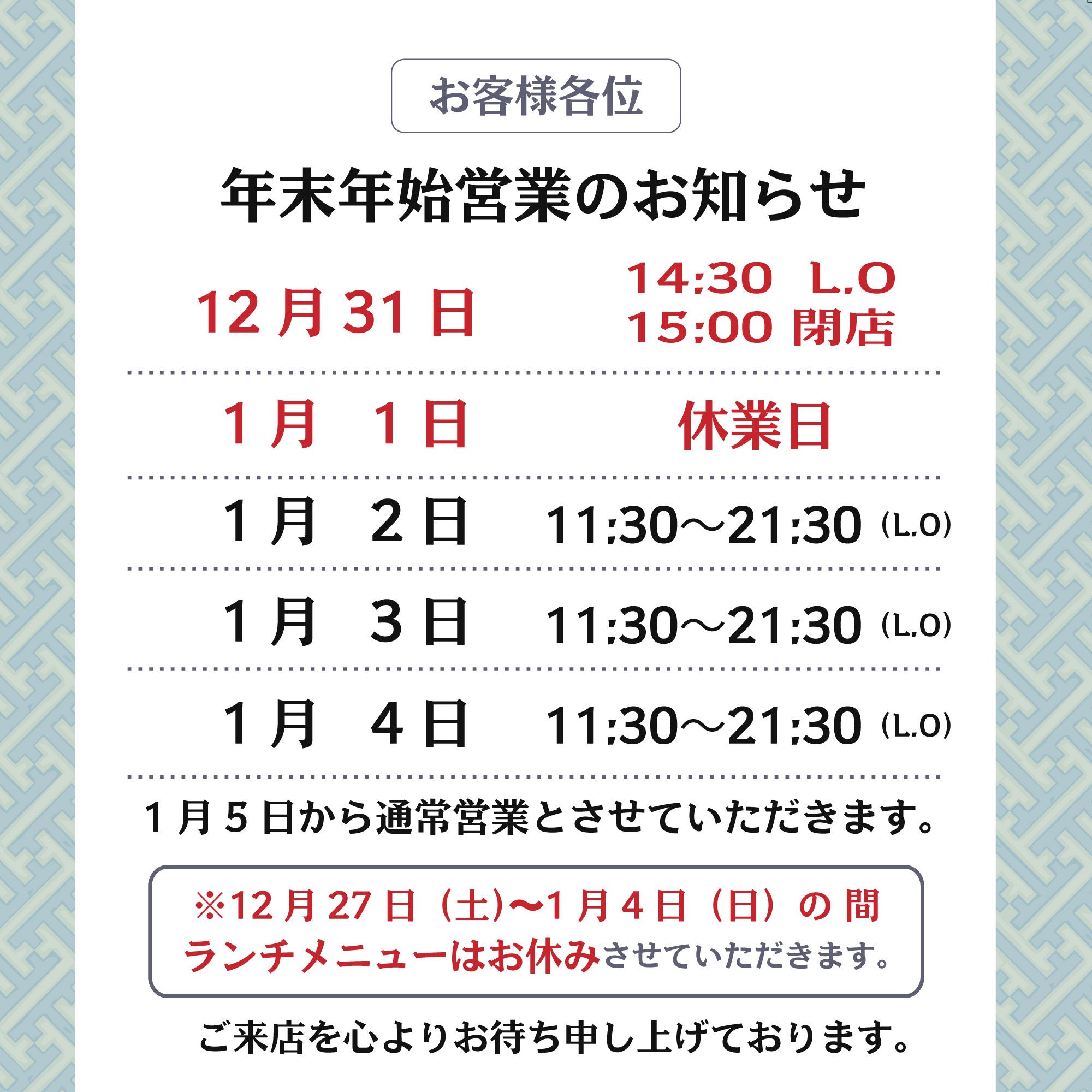 | 営業時間 | 11:30 - 21:30(ラストオーダー) |
